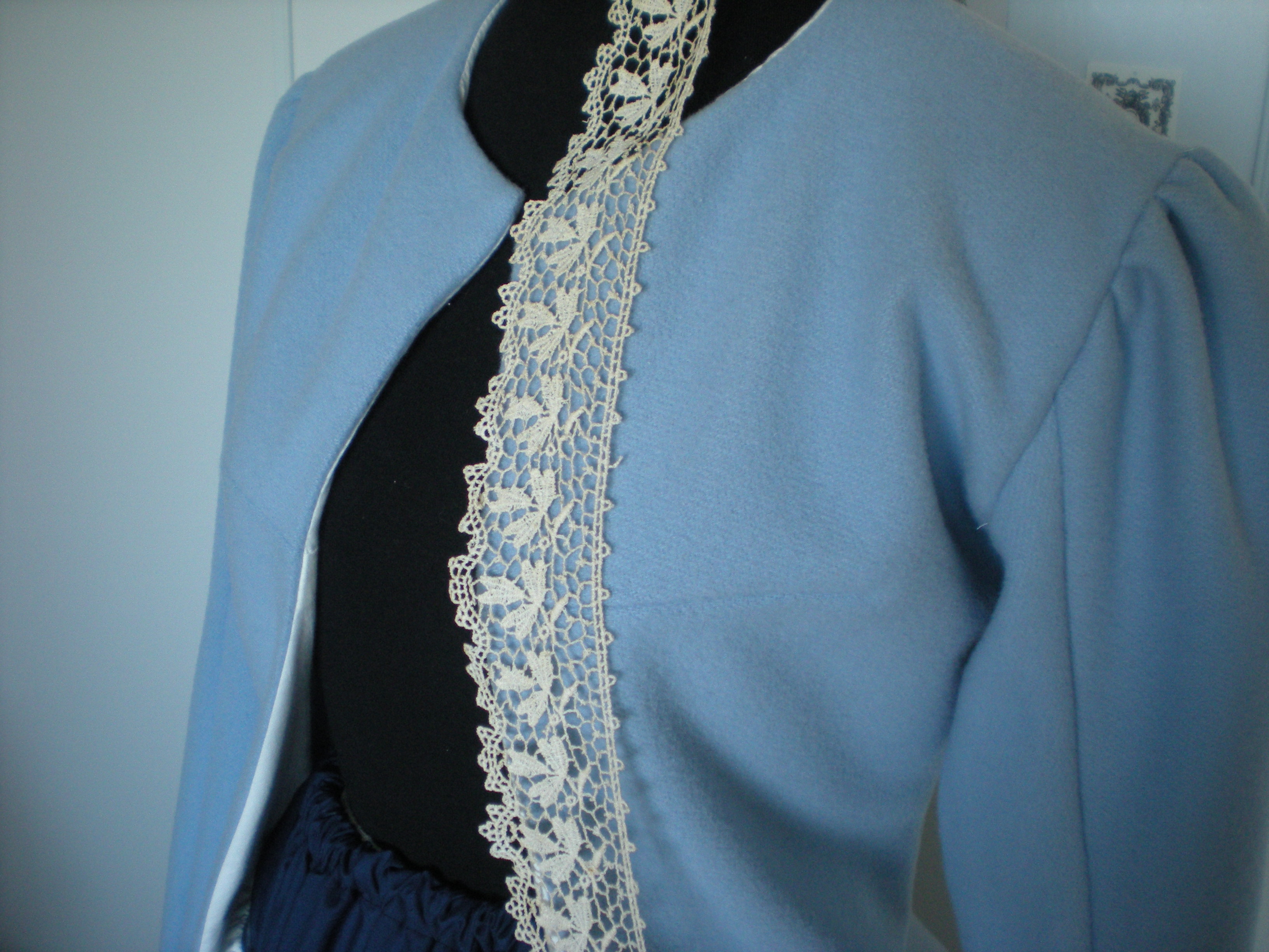 I found some forgotten lace in my stash that is the same beige color as the background of the jacquard, so I may put it along the front of the jacket. Alas, there is not enough to go all around the bottom of the peplum.