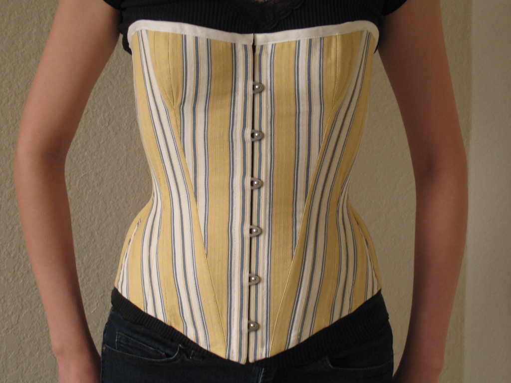 The outside of the corset is a thick striped cotton. The inside is a very sturdy hemp fabric used in place of coutil.