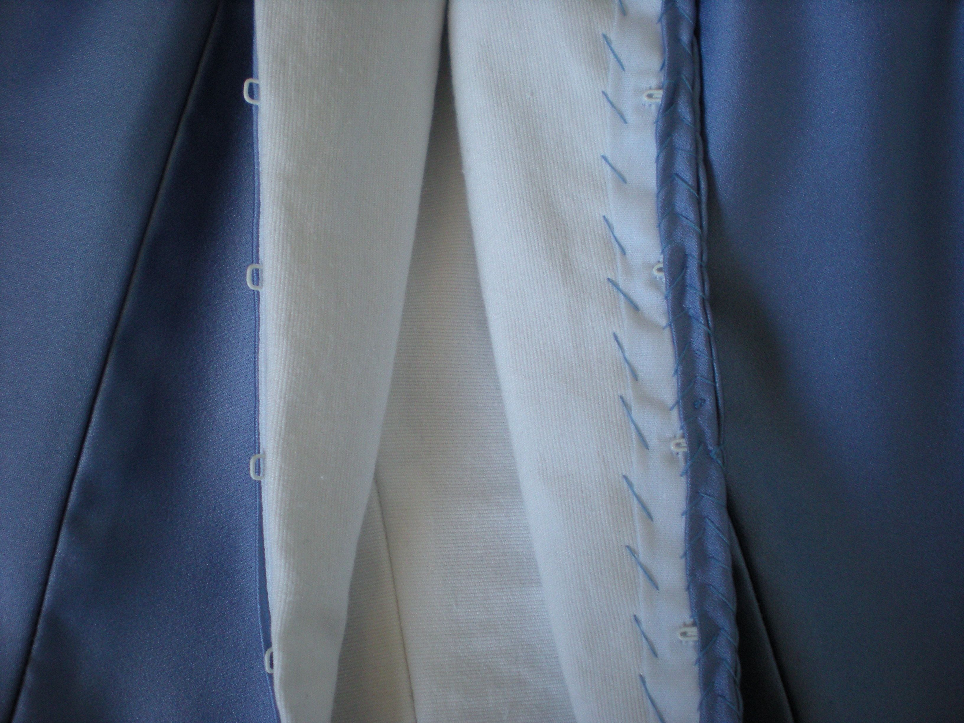 The back has hook-and-eye tape. The strip with the eyes is tucked in between the top and lining. I was originally going to do the same with the hooks, but realized that if I need to make alterations it would be easier to have the strip on the surface of the lining.