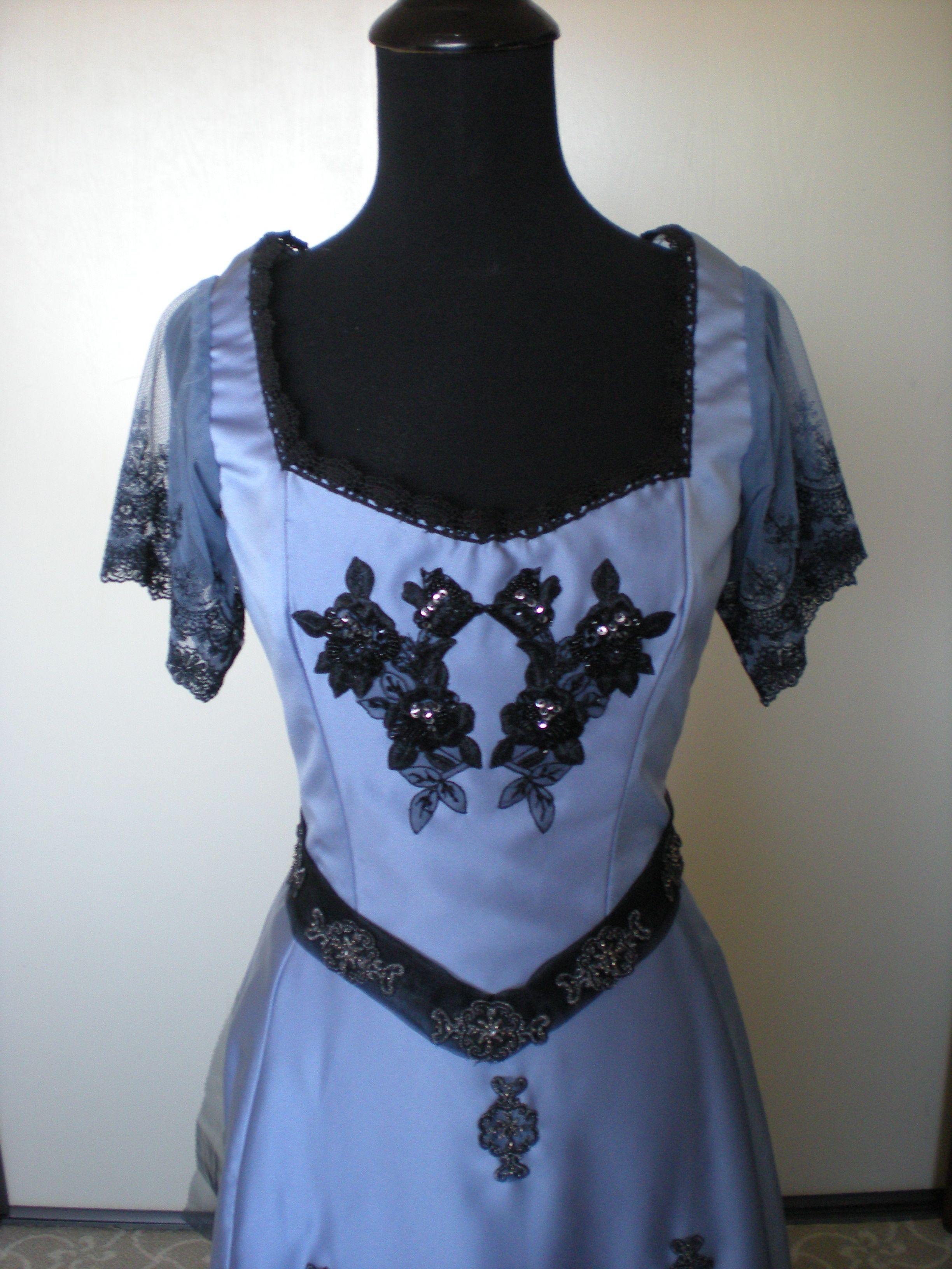 The blue satin, netting lace and appliques were purchased new for this project, and mostly on sale. The linings, cotton lace, zipper, thread, hooks and eyes were from my stash, which cut down on my overall costs even more. I did purchase the pattern for the skirt, and it’s a Truly Victorian, so I spent more on that ($17.50) than I usually do for a pattern.