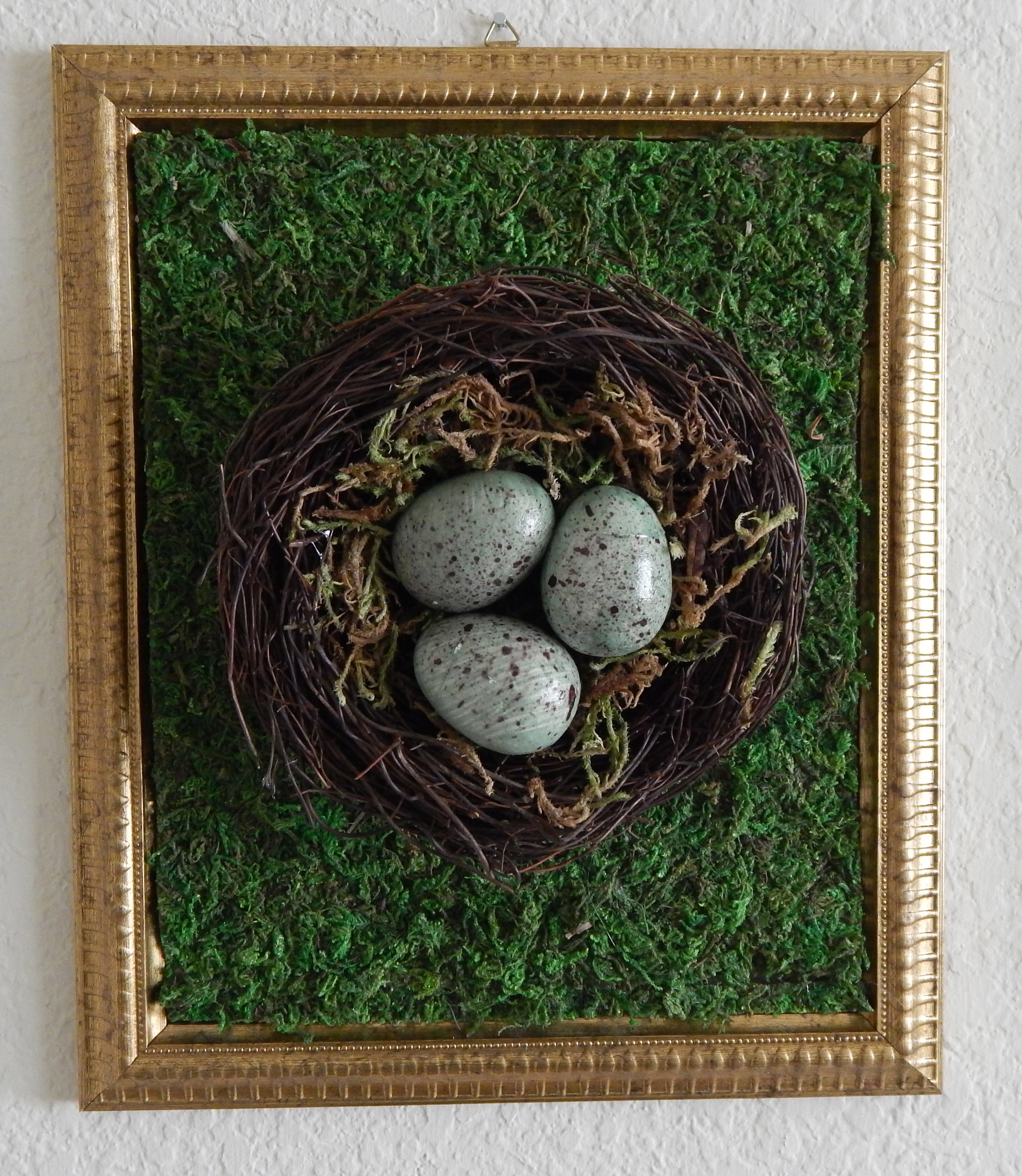 The moss, nest, bark and flowers were purchased from Sav-on Crafts.