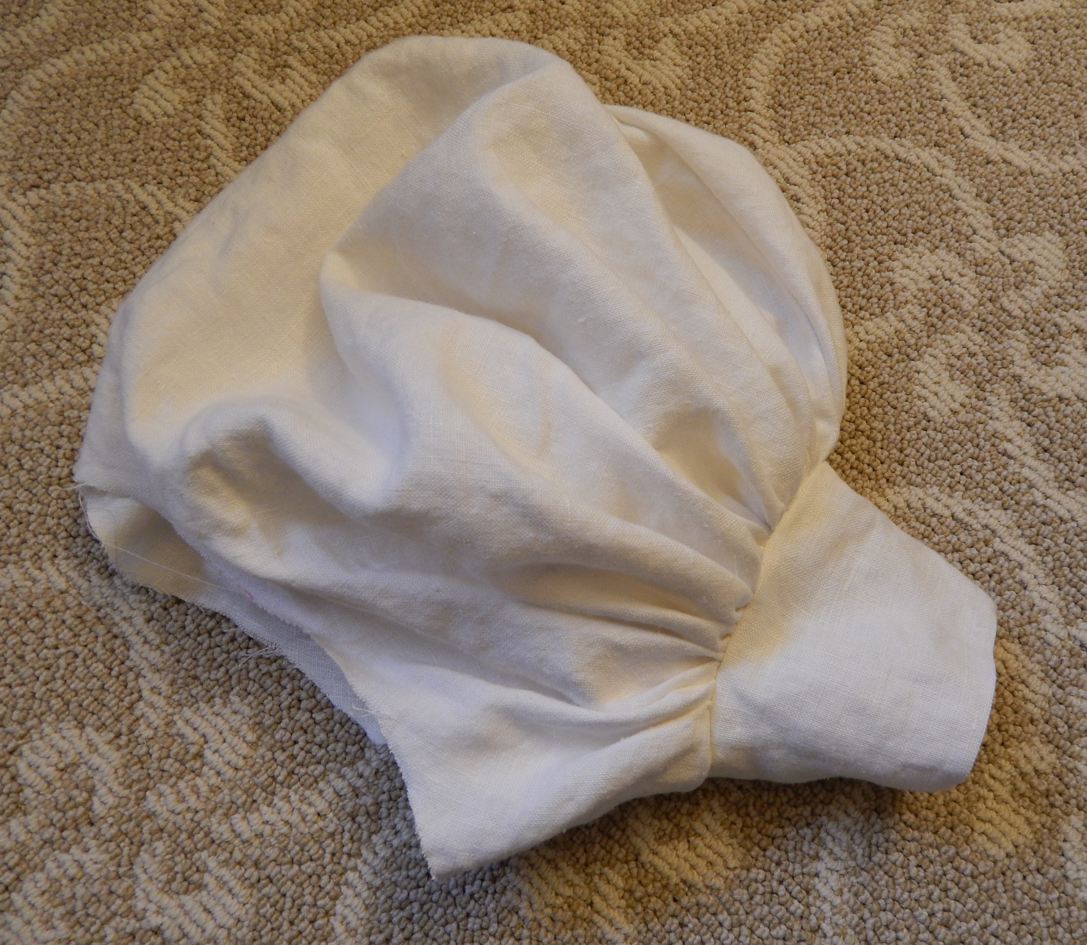 For my 1830s dress I made a pair of sleeve supports, aka sleeve poufs/poofs/puffs. The TV455 pattern does not include a pattern for sleeve poufs, so I had to make up my own. If someone has some good instructions for an easier or more historically correct method I’d be very interested in it!