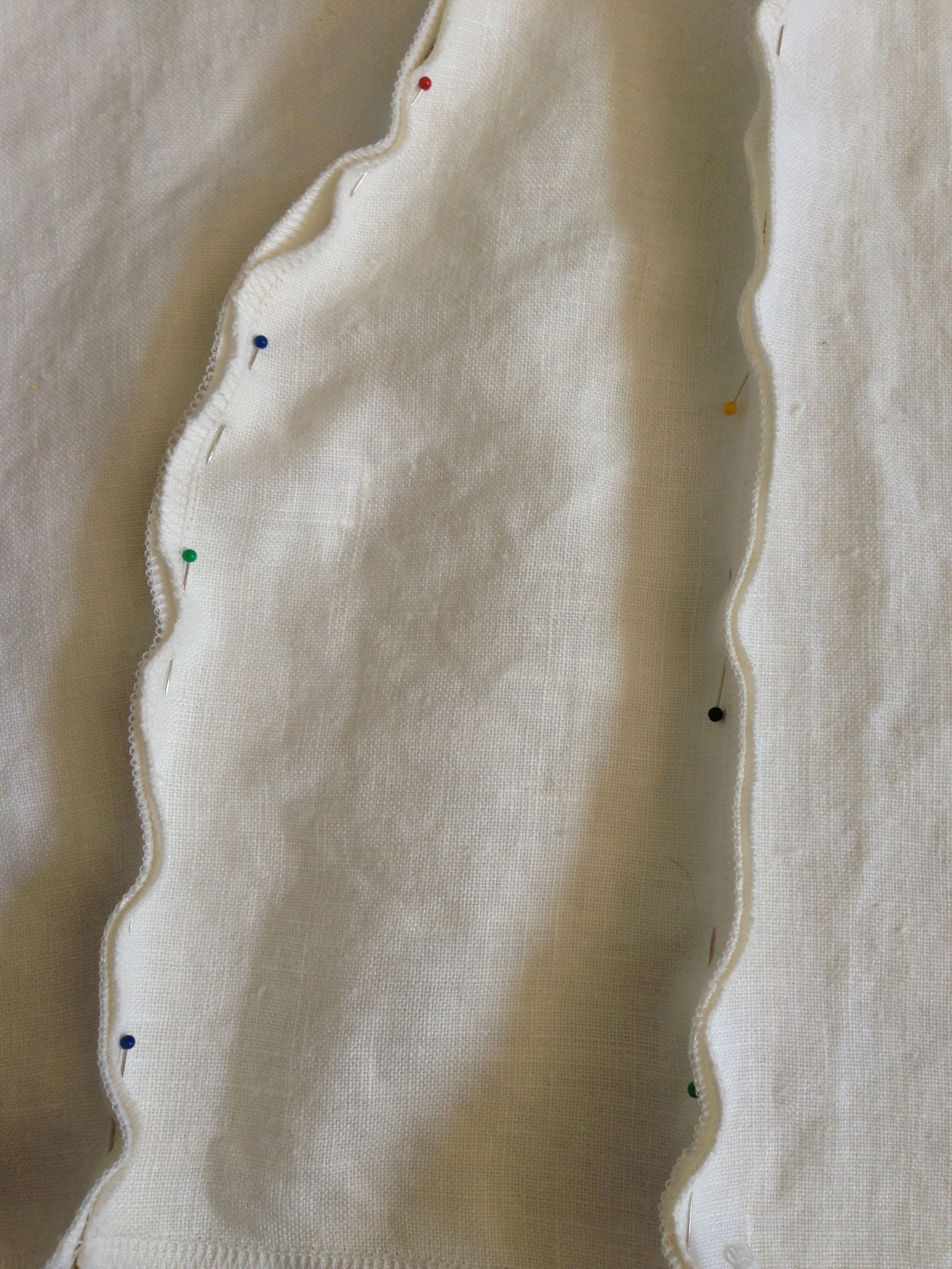 The TV455 pattern has a very large, mostly circular shape for the sleeve. The outside circumference is meant to be gathered into the shoulder seam, and the inner circle is gathered onto an armband. I cut two of these out of a thick linen.