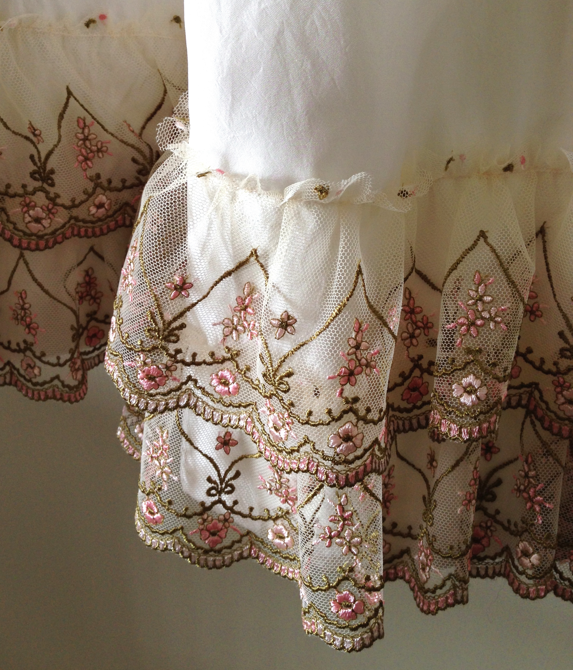 The TV455 pattern for the Romantic dress suggests using 2 layers of netting for the beret (evening) sleeve. For the gigot (day) sleeves the pattern suggests you make a “sleeve crinoline” using the beret sleeve pattern, using lining and netting fabric gathered to armbands. There are no instructions on making a stuffed pouf, but I wanted a little more support in case the sleeves got crushed.