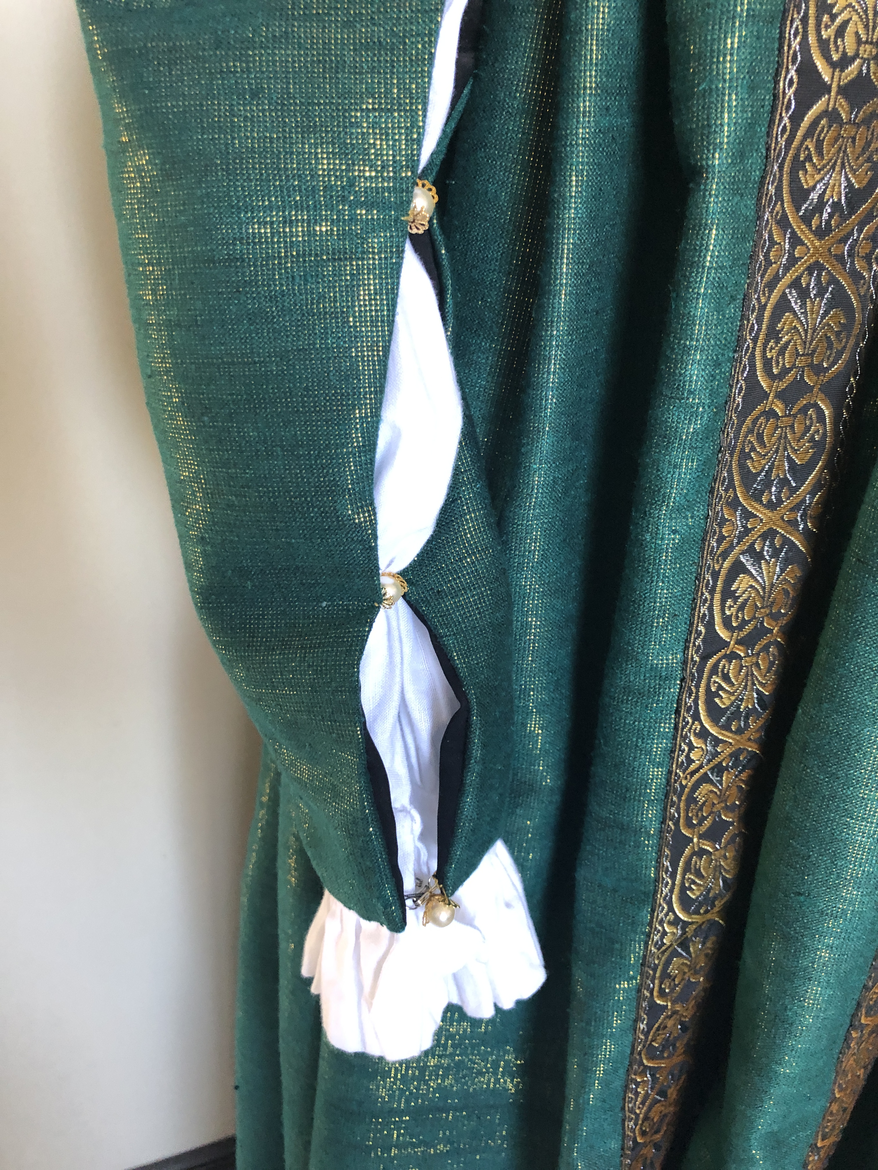 Underneath the dress I wore a Tudor chemise because that is what I had on hand. (It was also made using a pattern from the Tudor Tailor book). However, at a later point I’d like to make a Renaissance camicia with a different neckline and much fuller sleeves to puff out through the gaps in the green sleeve.
