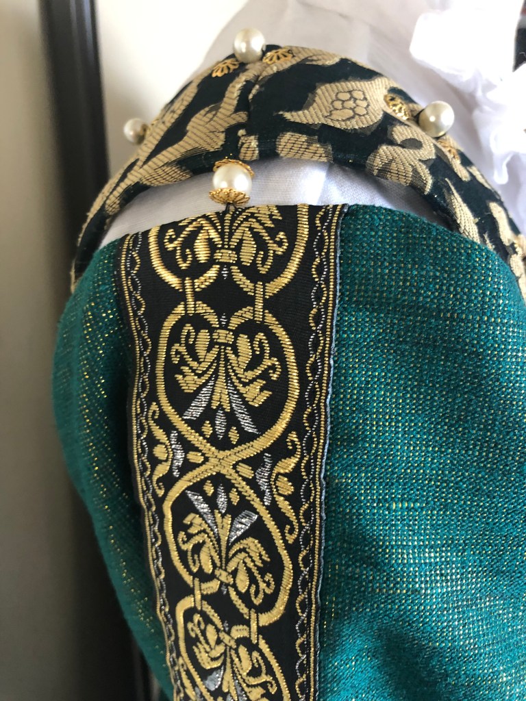I was making a Borgias-inspired Renaissance dress and decided to lean into to the green gold color scheme and make it a historical Loki variant costume. I wanted a Renaissance gown but being shiny and pretty was more important to me than historical accuracy so this isn’t pegged to a specific decade, but rather a look inspired by both the Borgias HBO show and the character Loki from the Marvel Cinematic Universe.