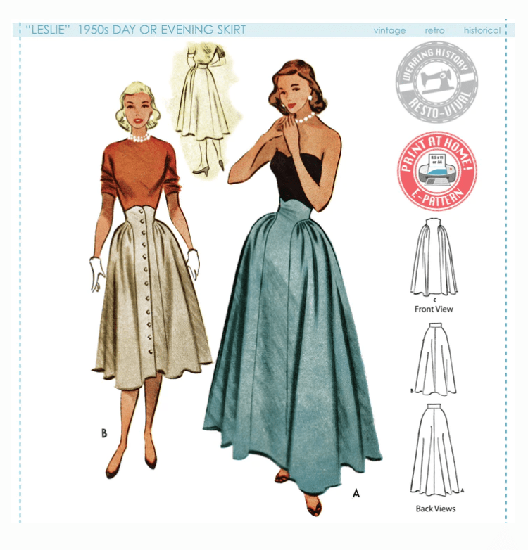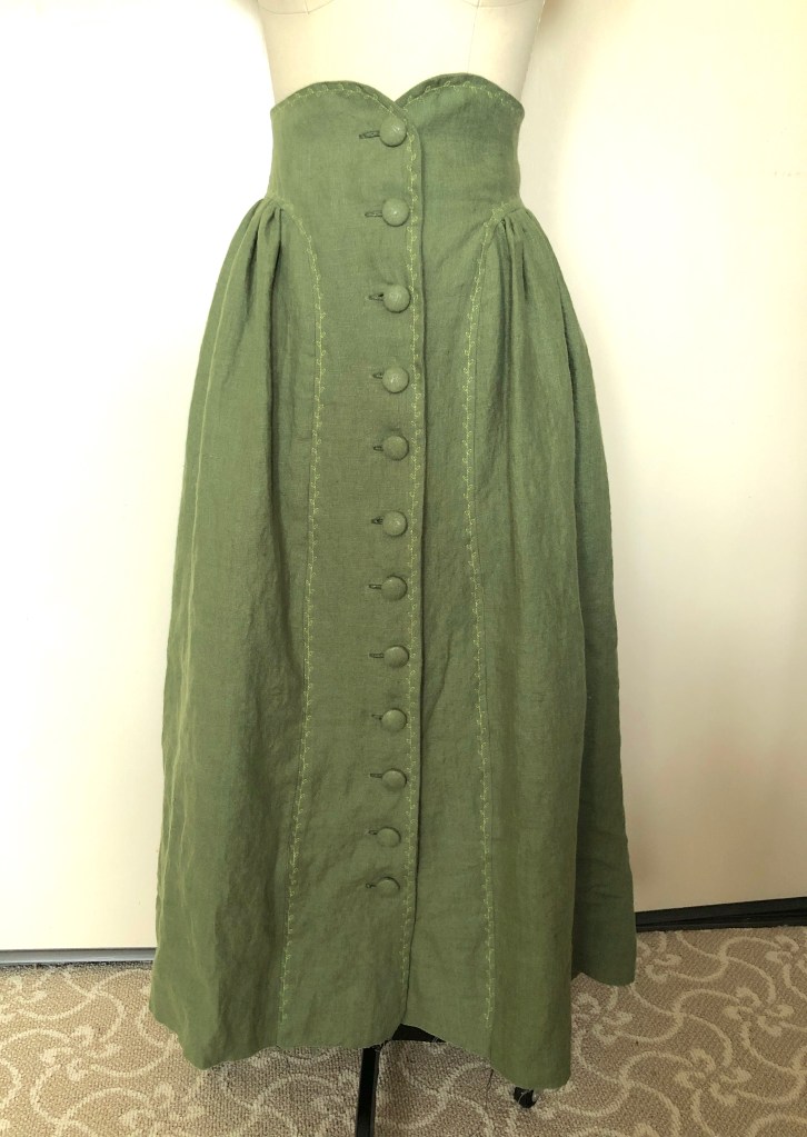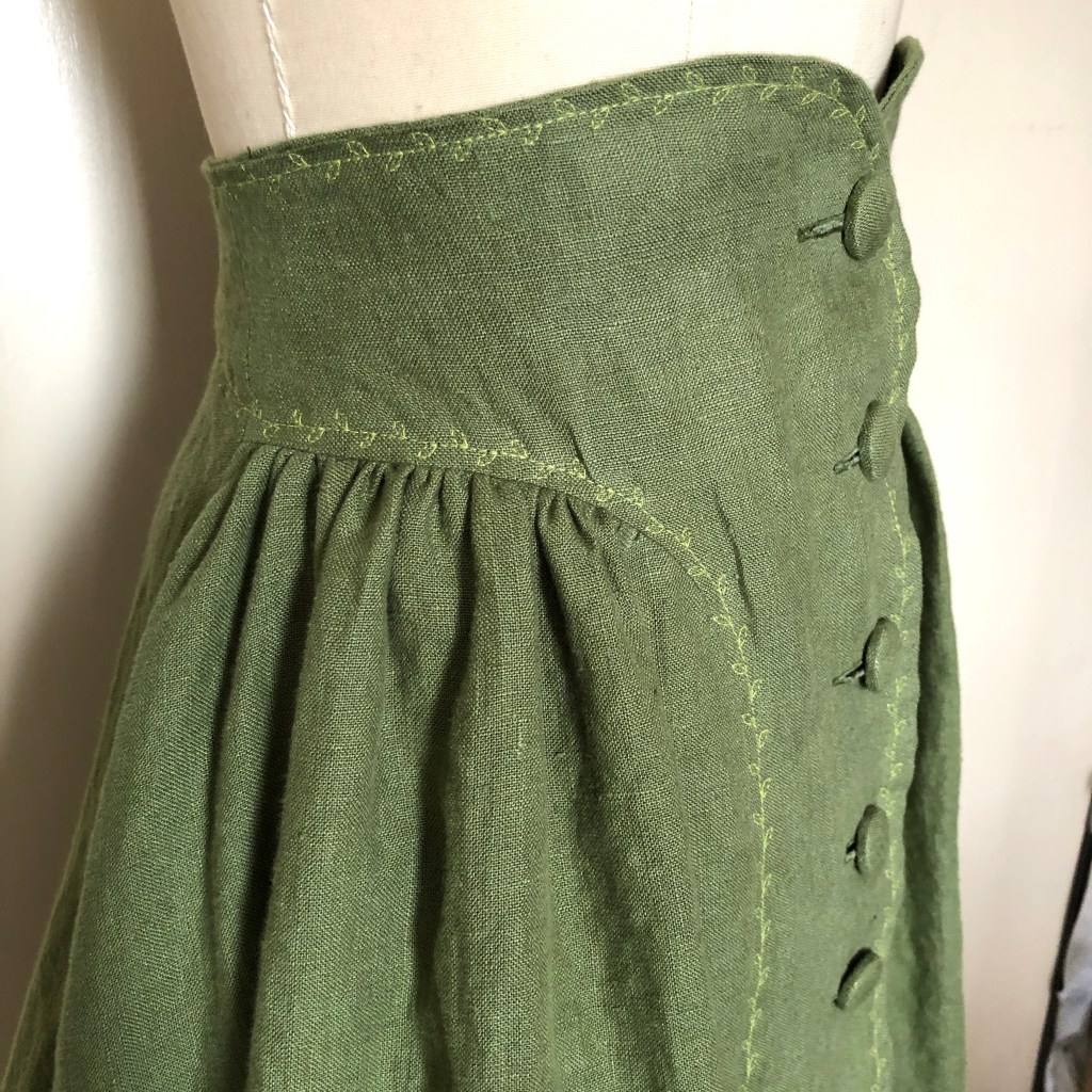 A few months ago I used the Wearing History Leslie skirt pattern to make a cute high-waisted 1950s skirt that also has some Edwardian vibes if made up in a long length. I was drawn to the high waist with the sweetheart shape and the column of buttons down the front. I used a green linen and top-stitched it with decorative vines in a lighter green to give it a bit of an elven feel.