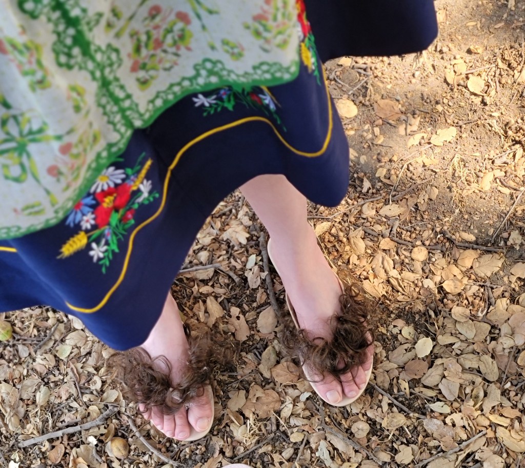 For the hairy hobbit feet I hot-glued hair to a pair of nude sandals. (My wig was so full I was able to cut some curls from it without making a difference in the way it looked). You can get the same sandals “Shoe Land Falema Women’s Flip Flops Casual Thong flat sandals Comfort Slides” from Amazon (affiliate link) and I found them to true to my usual size.