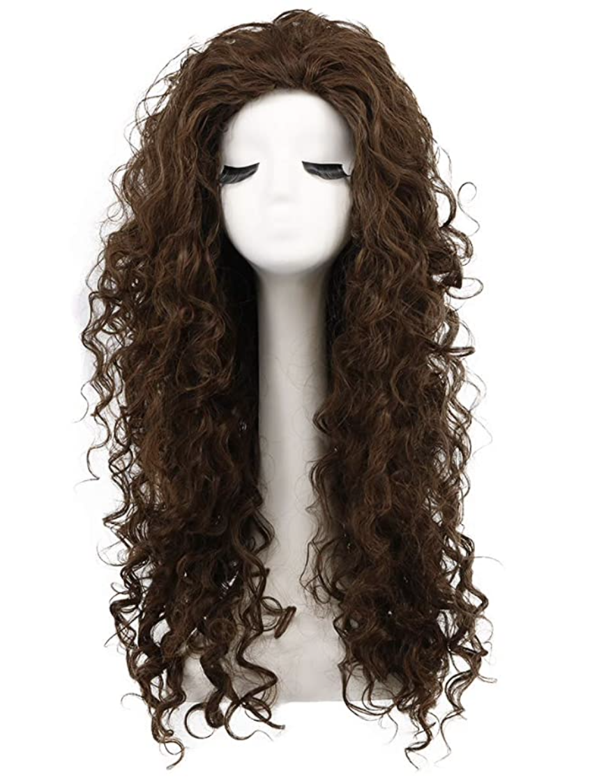 My wig is also from Amazon. It is called the “Karlery Women’s Fluffy Curly Dark Brown wig Halloween Cosplay Wig Anime Costume Party Wig” (affiliate link) and I thought it was very nice for $26.98! It was incredibly full and fluffy and a very natural-looking color and texture.