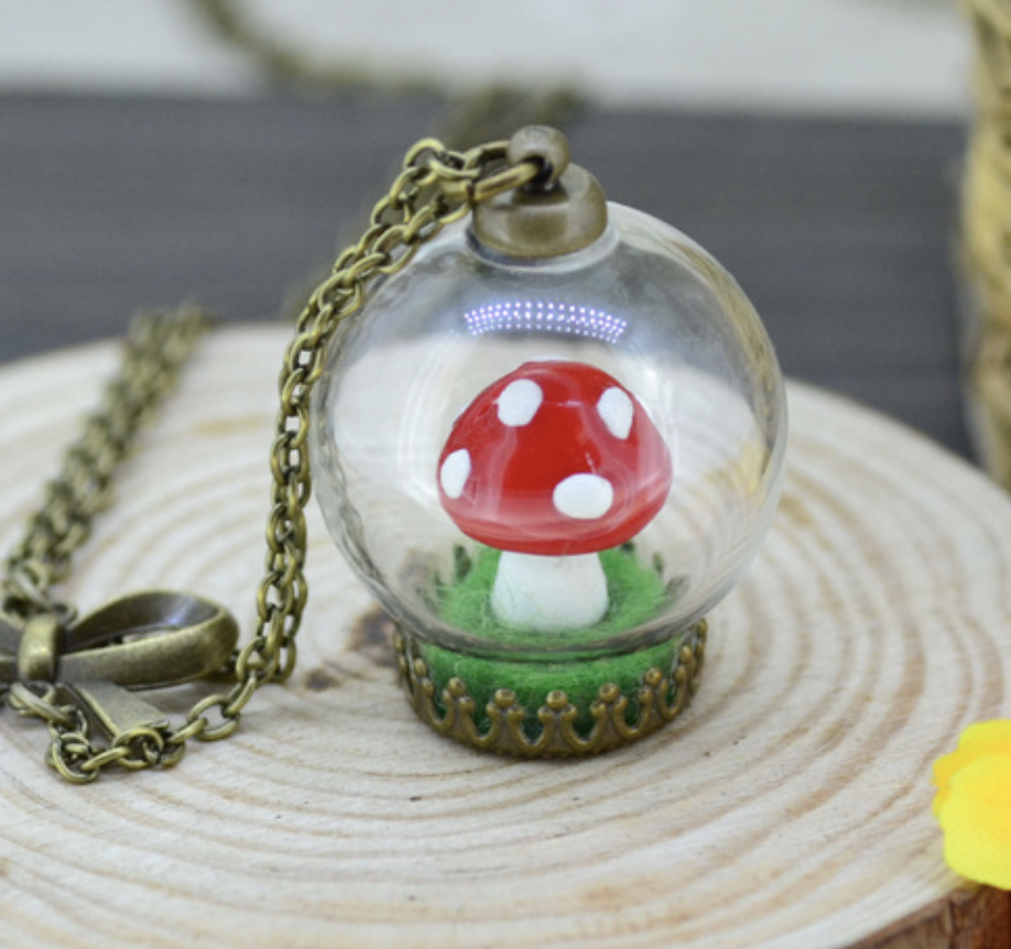 I wore a mushroom in a glass dome necklace I bought on eBay many years ago. It’s no longer available there but I’ve seen some very cute ones if you search for “mushroom terrarium necklace.”