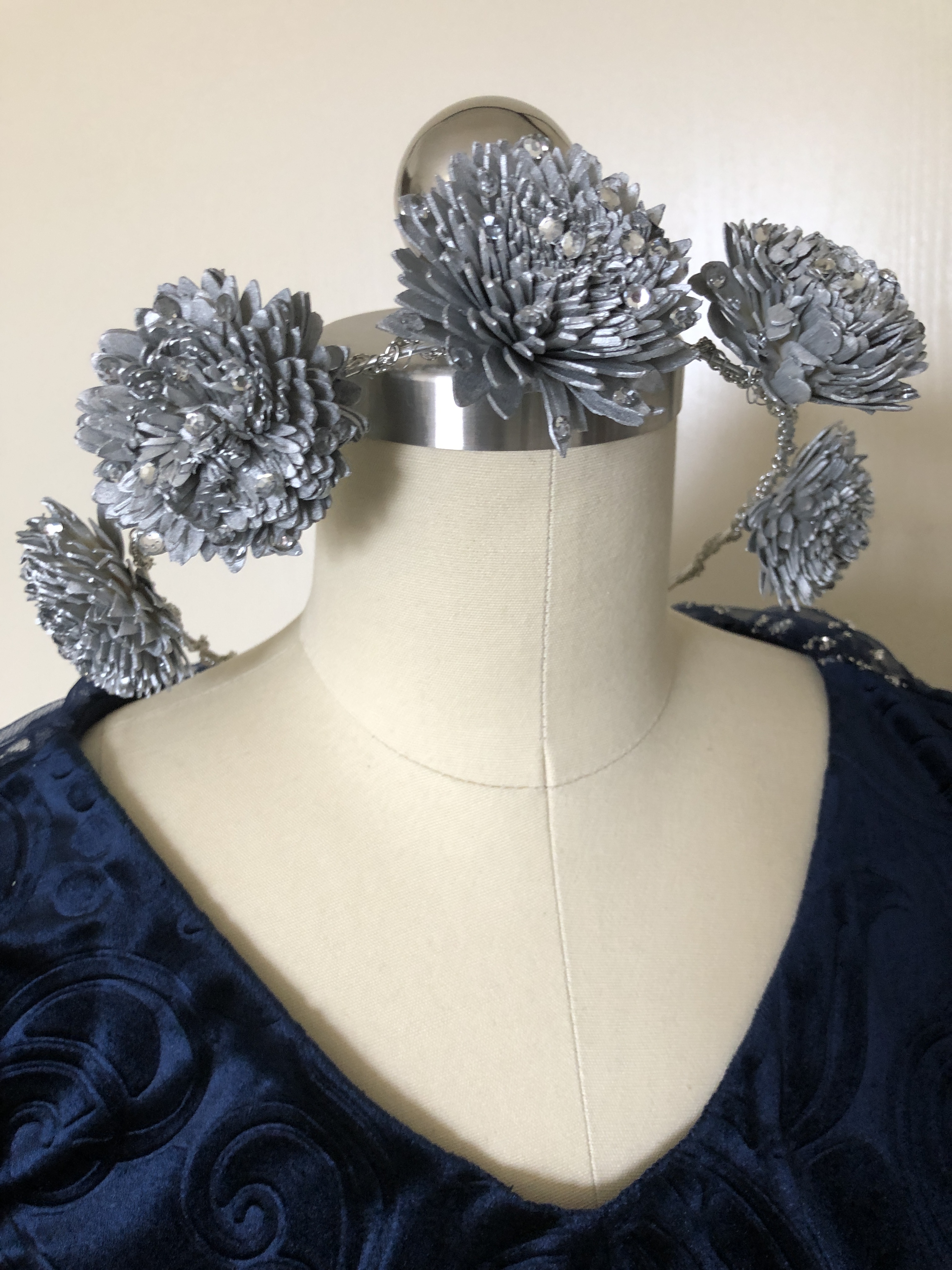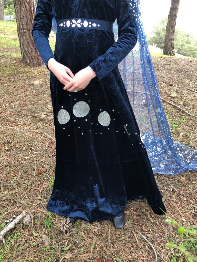 I made the main body of the dress using an embossed navy blue velvet, and the cape is a sheer netting with silver glitter stars.