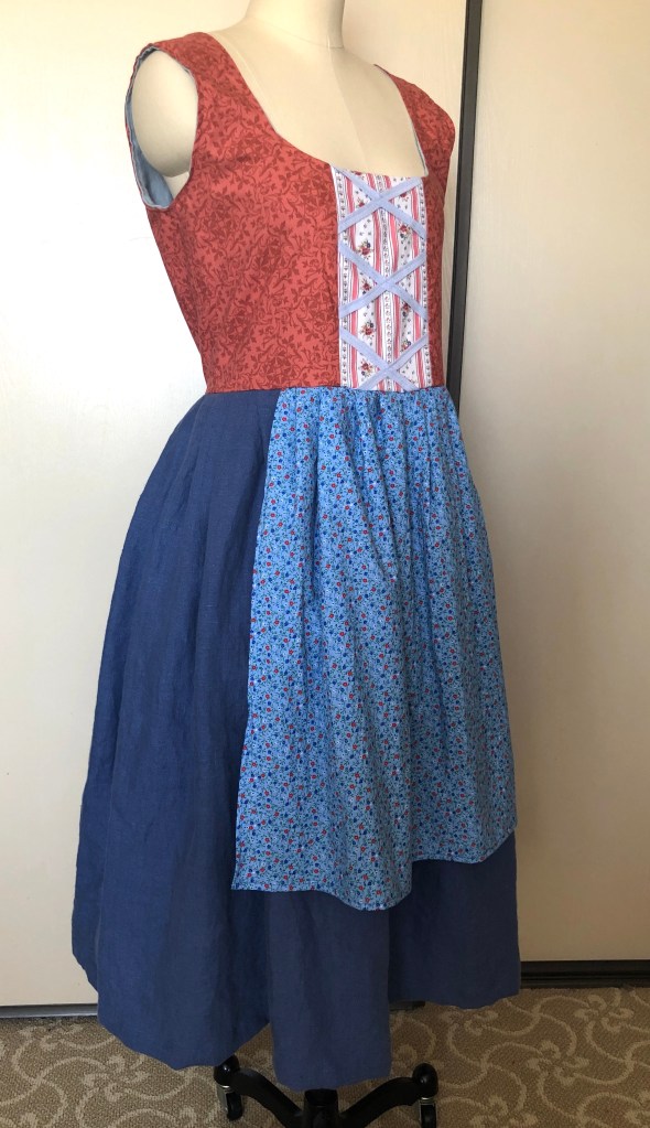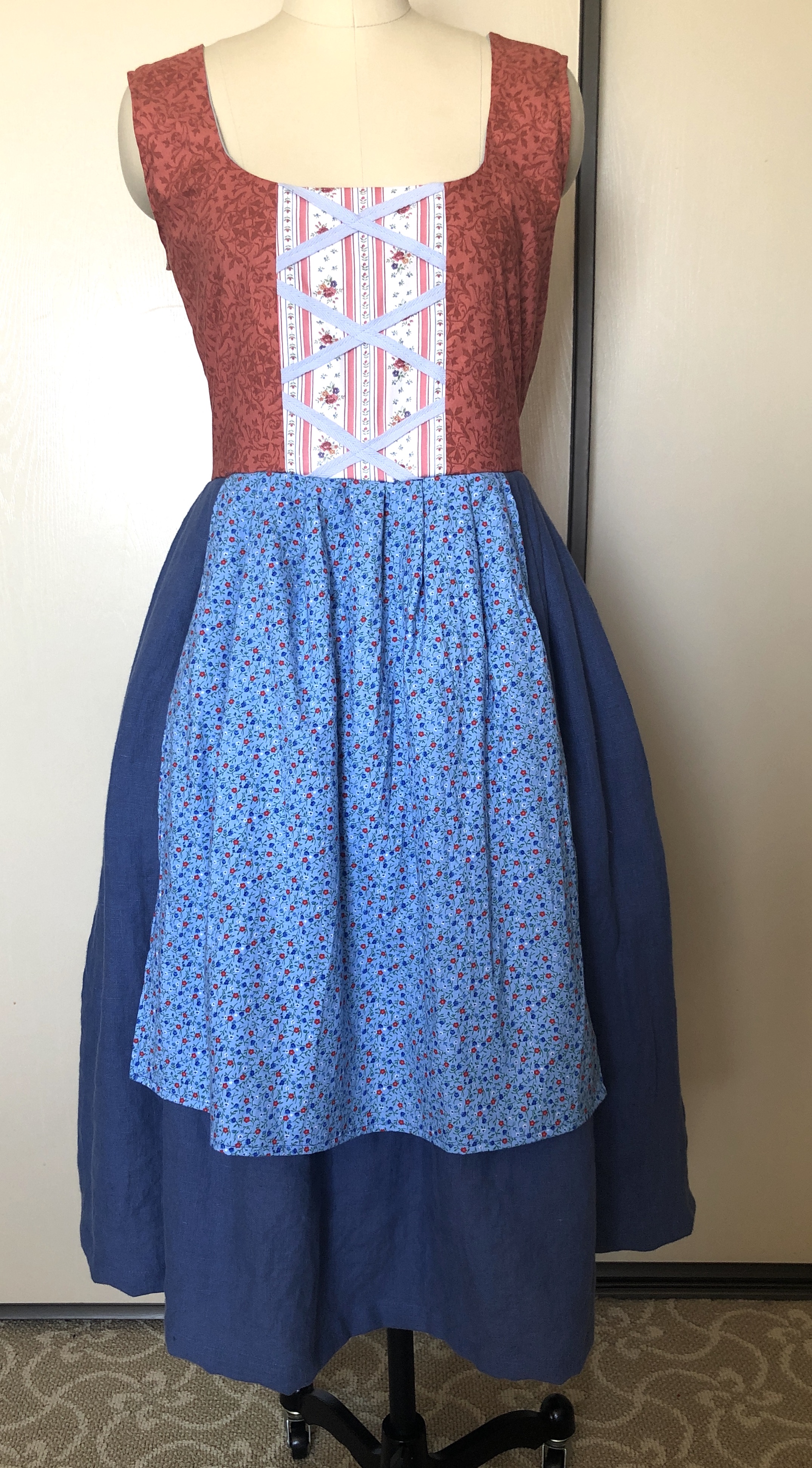 If you are a fan of the Lord of the Rings books or movies, you’re probably a fan of hobbits, those charming folks whose ladies wear very cute pastoral outfits. With the new Rings of Power show coming out soon I thought this would be a good time to show you an easy hobbit lady outfit. Many of the hobbit women wear a 4 separate garments: a blouse, a bodice that laces up the back, a skirt, and an apron. To simplify the sewing and getting dressed, I decided to turn the last 3 items into one zippered dress. This dress also works great for a trendy cottage core look, and is a wonderful stash-buster for combining all those various fabric scraps you have that aren’t enough to make up a full garment by themselves.