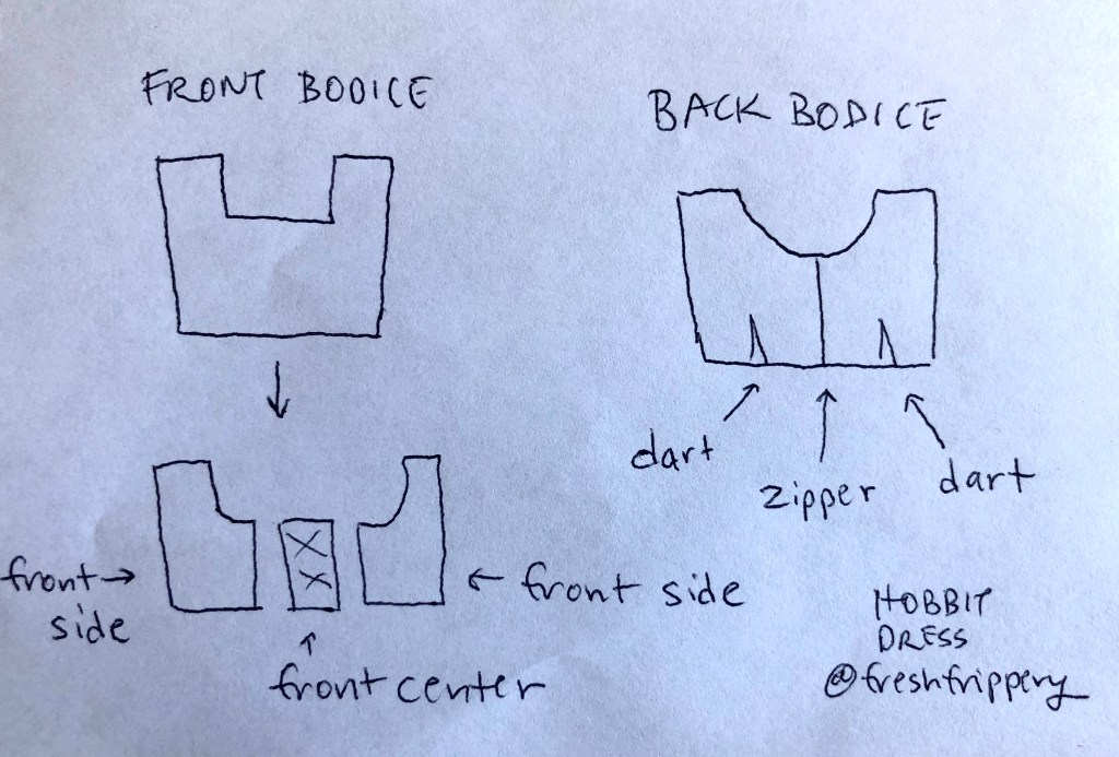 I self-drafted my own pattern (with the basic shapes shown below) but you can start with any square-necked basic bodice, or a dirndl-style dress that fits you. You will take your pattern and slice the front bodice into 3 parts (a front center and 2 front sides). The front center is going to be a different color of fabric that we will add criss-crossed twill tape or ribbons to. The width of your front center will depend on your body measurement, but for reference I cut a 6″ wide panel (for a 5″ finished panel with seam allowance) for a 34″ bust.