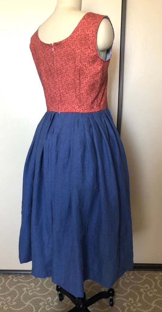 Pleat the top of the skirt to fit your bodice, matching up the side seams of each. Sew the bodice to the skirt and press the waist seam open and flat.
