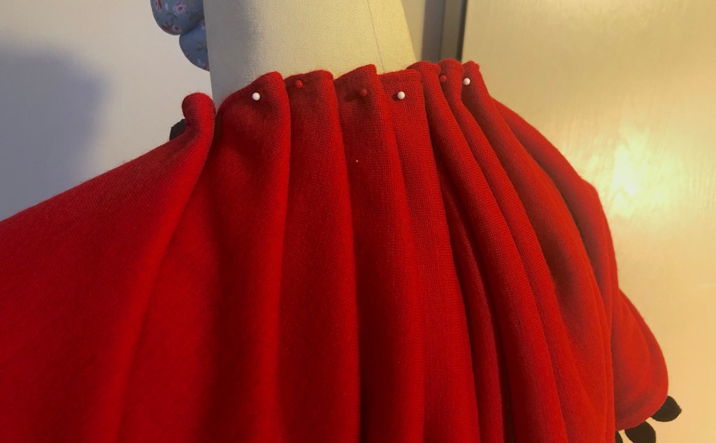 Pleat the neckline area (up to where the pompoms start) to fit the curve of your neck. The finished curved area should cover the back half of your neck. (If you have a dress form handy, an easy way to determine how to do the pleats is to pin the center back seam to the center back of the form, pin where the pompom trim starts to the shoulder point on the form, then pleat using the neck of the form as a guide). To keep the pleats in place, stitch down the pleats over the previous topstitch line either by machine or by hand.