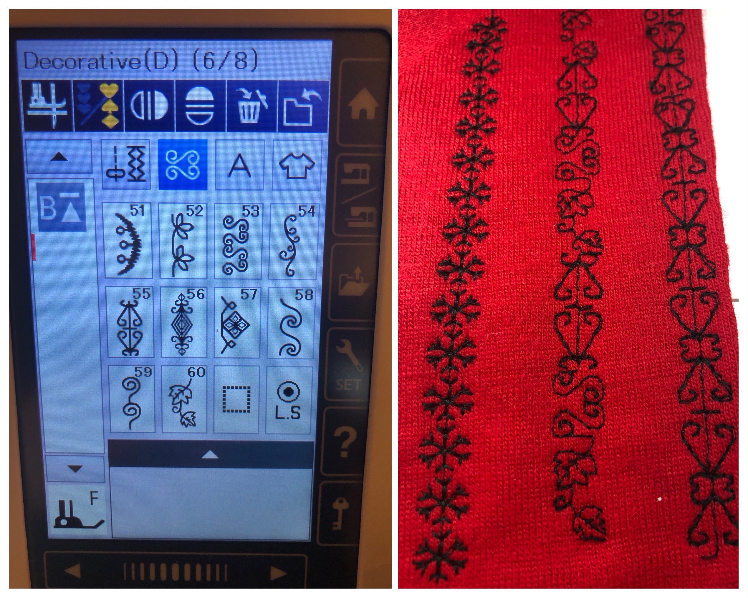 Optional: Use one of the embroidery stitches to add some extra decorative details to your shawl. Some ideas include using a continuous stitch along the edges of the shawl, or putting a monogram on the tails. You can also do a decorative stitch along the edge after the shawl is sewn, rather than using pompom trim. (These examples are under the Decorative stitch menu on my Janome Skyline S9).