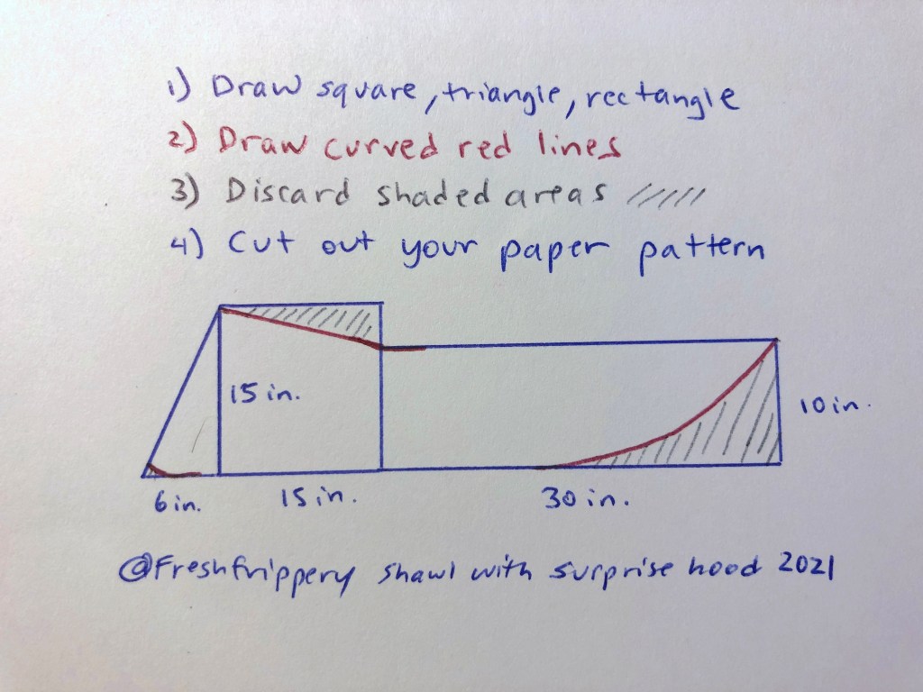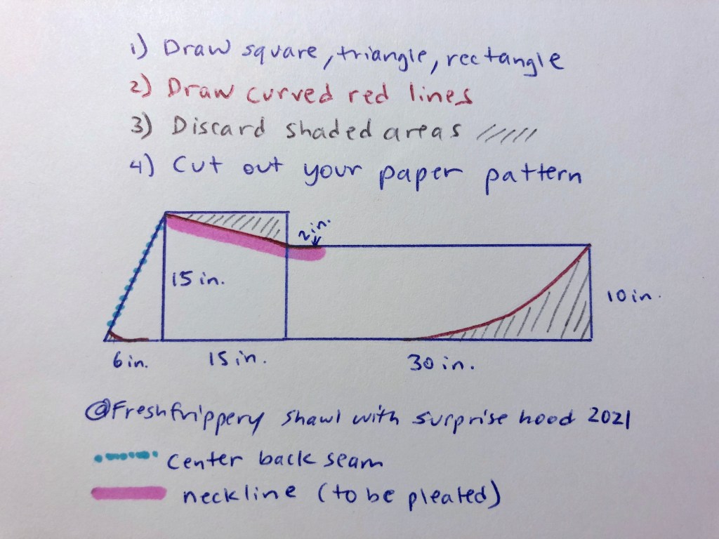 Now you have your pattern that you can cut out of paper and use to trace onto your fabric! (This includes 1/2 inch seam allowance. You can add more when cutting out your fabric if you want your shawl a little wider or are skipping any trim).