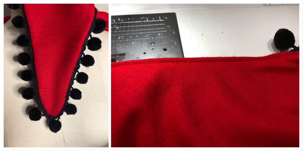 Turn the right sides out through the opening in the neckline, exposing the pompom trim. Fold in the raw edges of the neckline and topstitch closed.