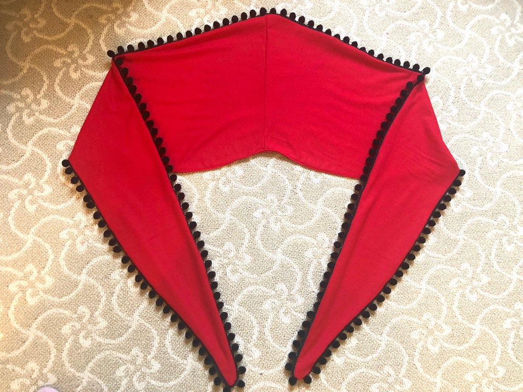 Winter is here and I wanted a cute and cozy accessory that was a nice shawl, but also a surprise hood and scarf! I made this out of a wool knit jersey but other soft fabrics with a bit of drape would work as well. I added some pompom trim for whimsy but that is optional; this surprise hood would work well untrimmed, or finished with decorative stitching or other touches. This was inspired by Victorian mantelets with front lappets, knit sontags, chic old Hollywood head scarves, and modern cozy.