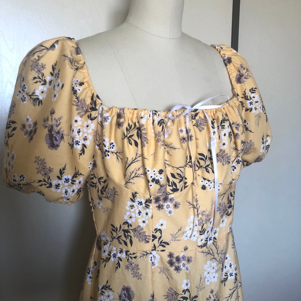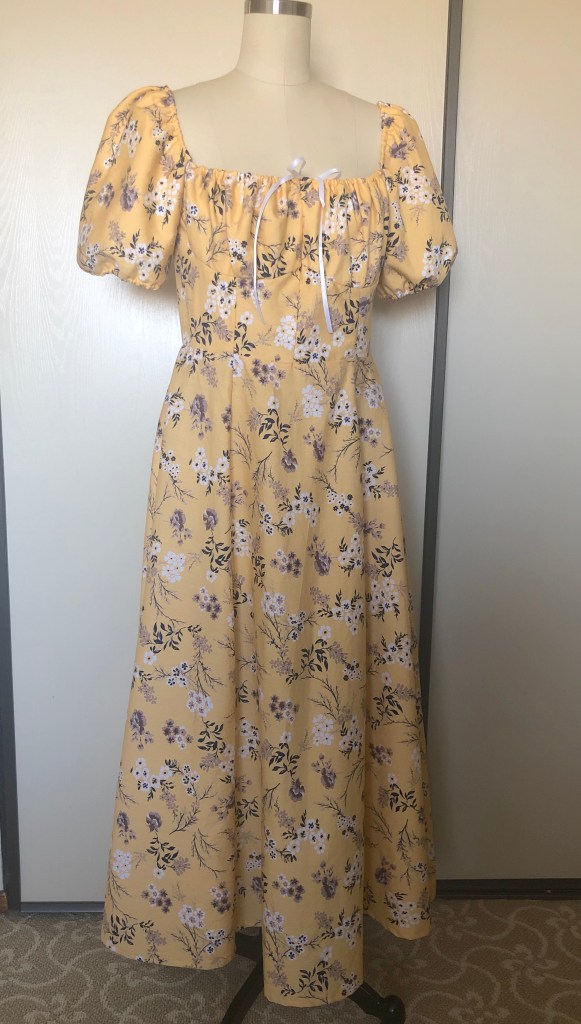 Warm weather means pretty cotton frocks to me so I just recently completed this yellow floral dress, inspired by the cute “milkmaid” style dresses. A lot of cotton prints are a bit thin and require some lining, and I have a special trick to save time by using my serger instead of cutting out the lining twice (later in this post).