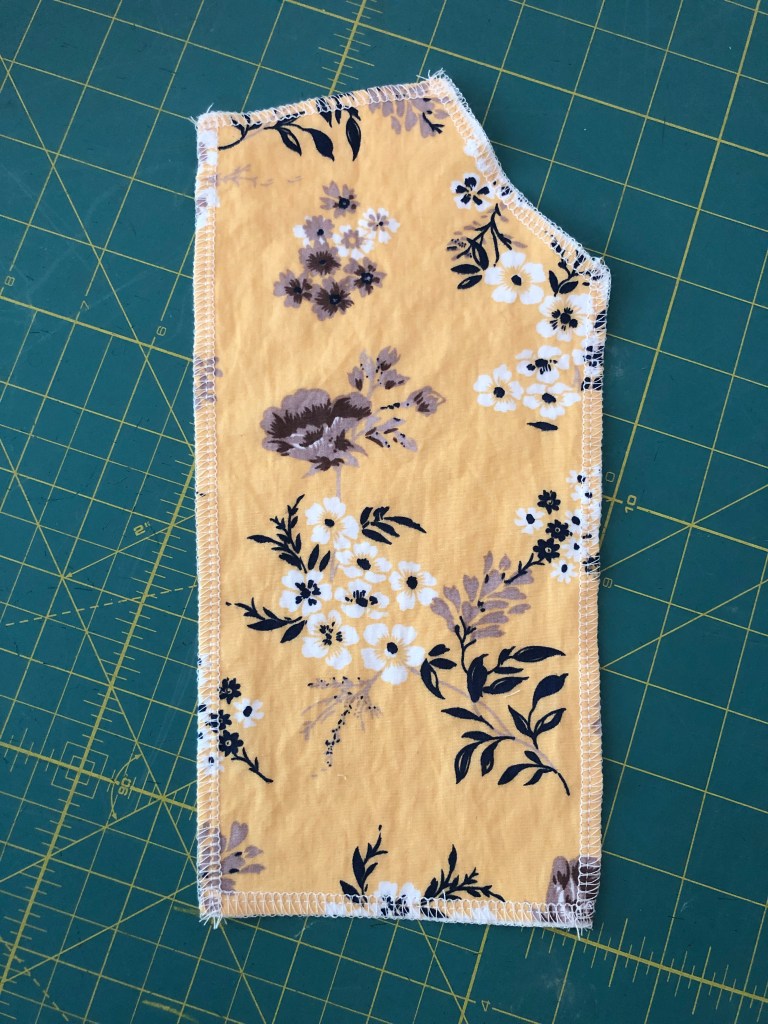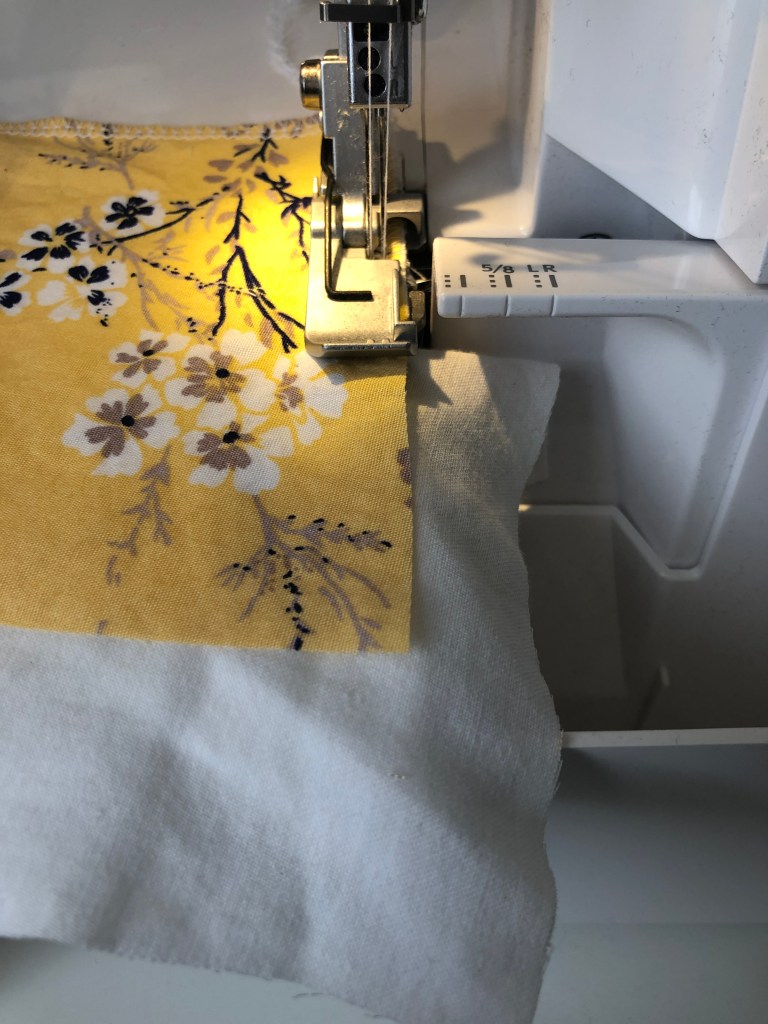 Then I serge the edges of the fashion fabric, while using the built-in blade of my serger to trim away the excess lining. This saves me the trouble of carefully cutting out the lining and making sure all the edges line up perfectly before sewing!
