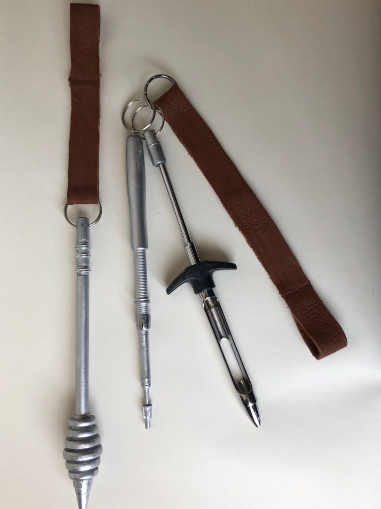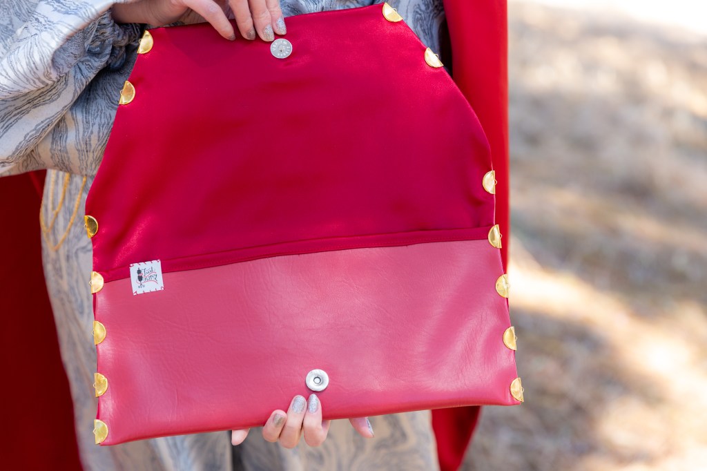The purse is a clutch made of brick red pleather and lined in the same fabric as the cape. The purse flap is pleated like the Armorer’s apron and has her tools appliqued in silver. I created the design using my Silhouette Design Software and used glitter heat transfer vinyl.