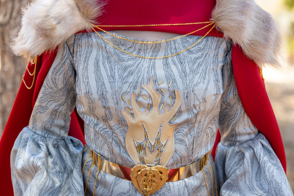 I used gold pleather to make a flame appliqué on the bodice to reference the forge where the Armorer works, and accented the appliqués with gold glass beads. The belt is a gold metal band that closes with an art nouveau clasp in the front. Gold chains hang from the belt on each hip.