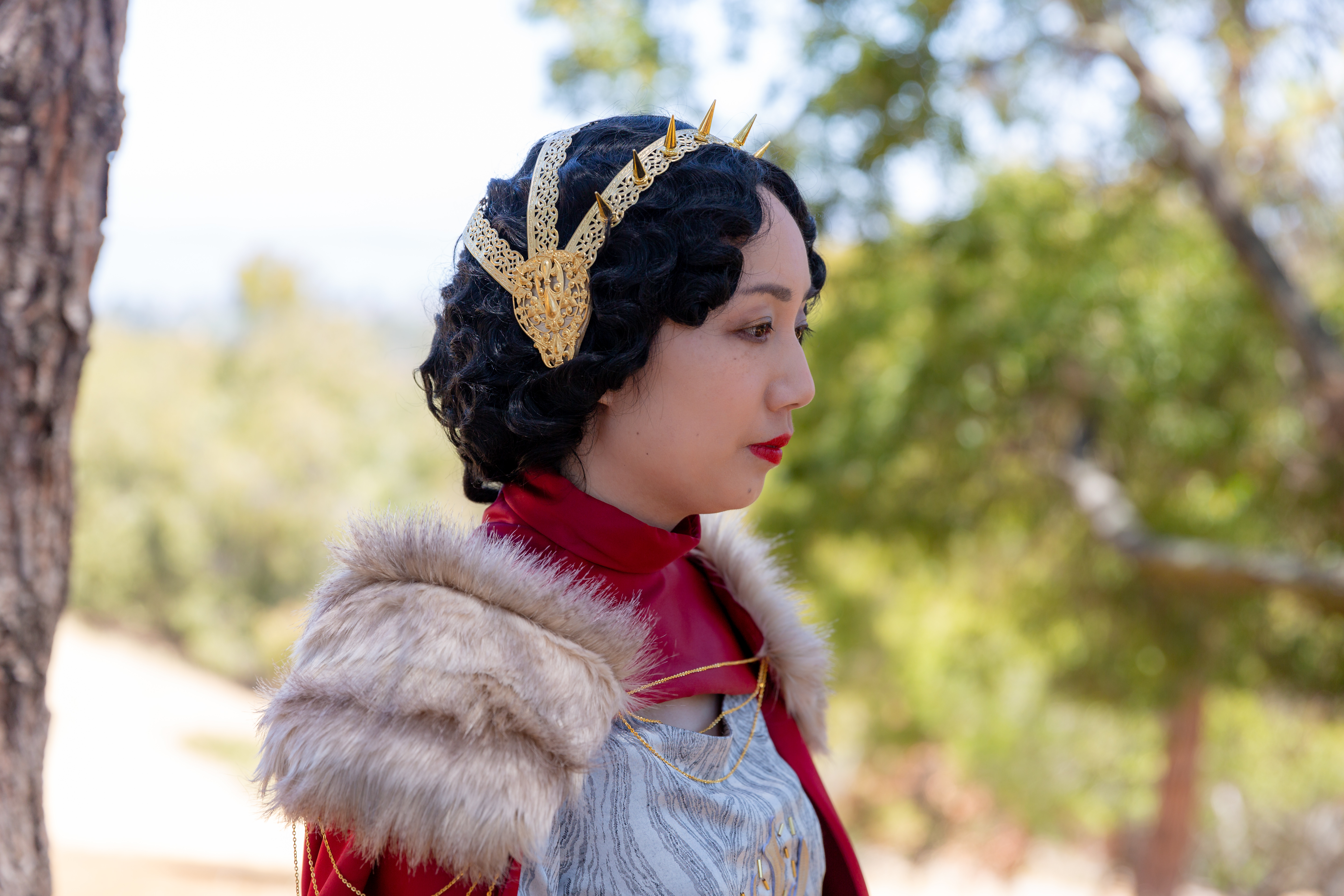 The headpiece is inspired by 1920s/1930s flapper headdresses and consists of 3 brass bands across the top of the head, attached to art nouveau style large decorative brass pieces over the ears. The front band has small golden spikes like a crown. The bands and ear pieces are wired together but the spikes are attached by drilling holes in the bands and screwing them in. I also added some gold pleather padding inside the ear pieces for comfort.