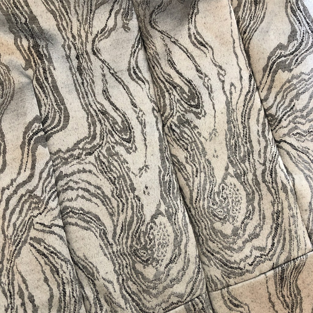 I love this fabric! Below from left to right is a dart, then an invisible zipper, then another dart. Running horizontally is a seam.