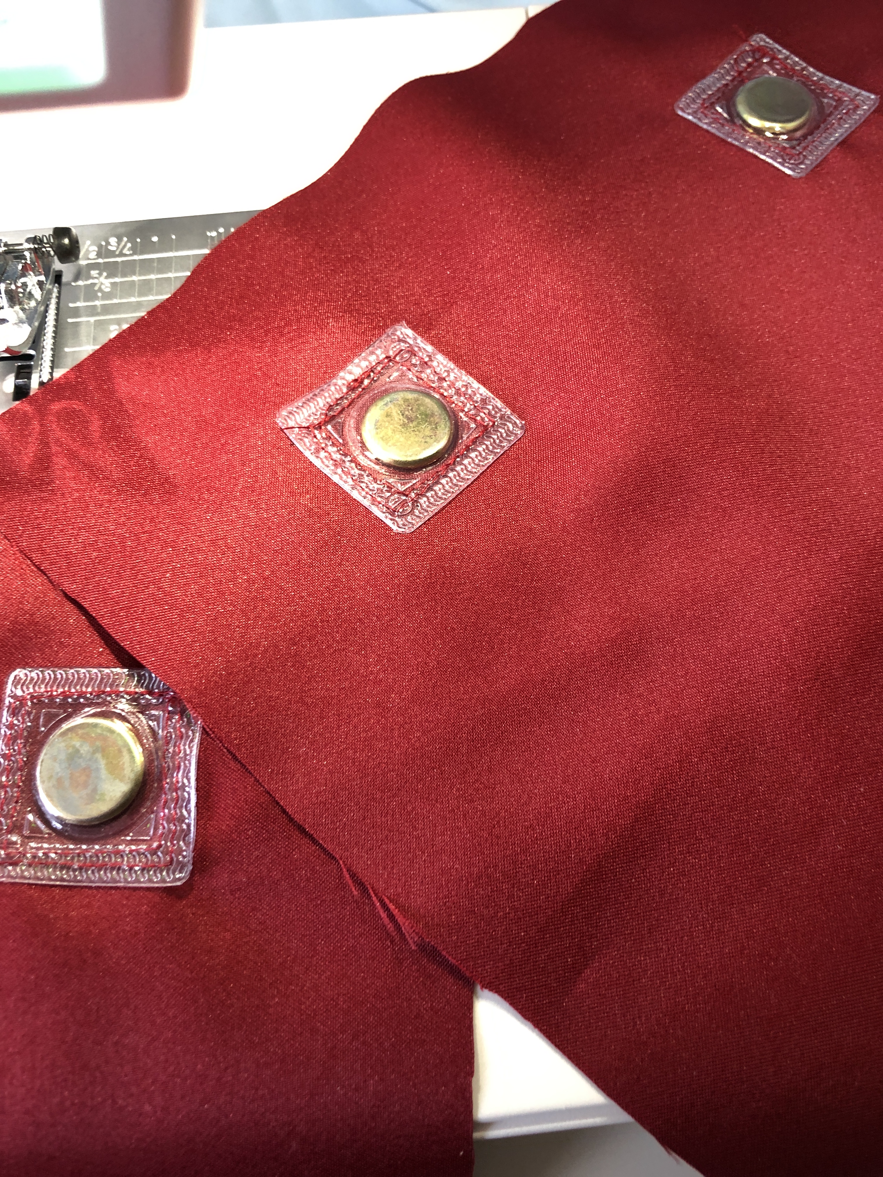 The cape closes at the neck with hidden hooks and bars. Then the epaulets and chains go on top, and I have hidden magnets sewn into the shoulders of the cape and the underside of the epaulets. The magnets I used are encased in plastic so I can sew them on. Here are some test pieces I did so you can see what they look like: