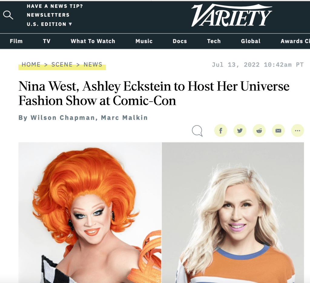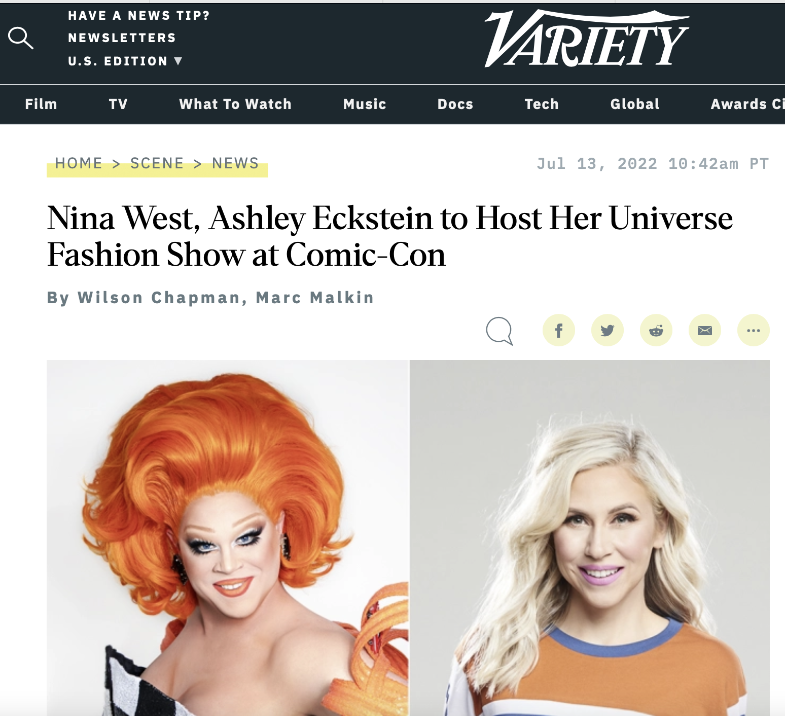 “Nina West, Ashley Eckstein to Host Her Universe Fashion Show at Comic-Con” (Variety July 13, 2022)