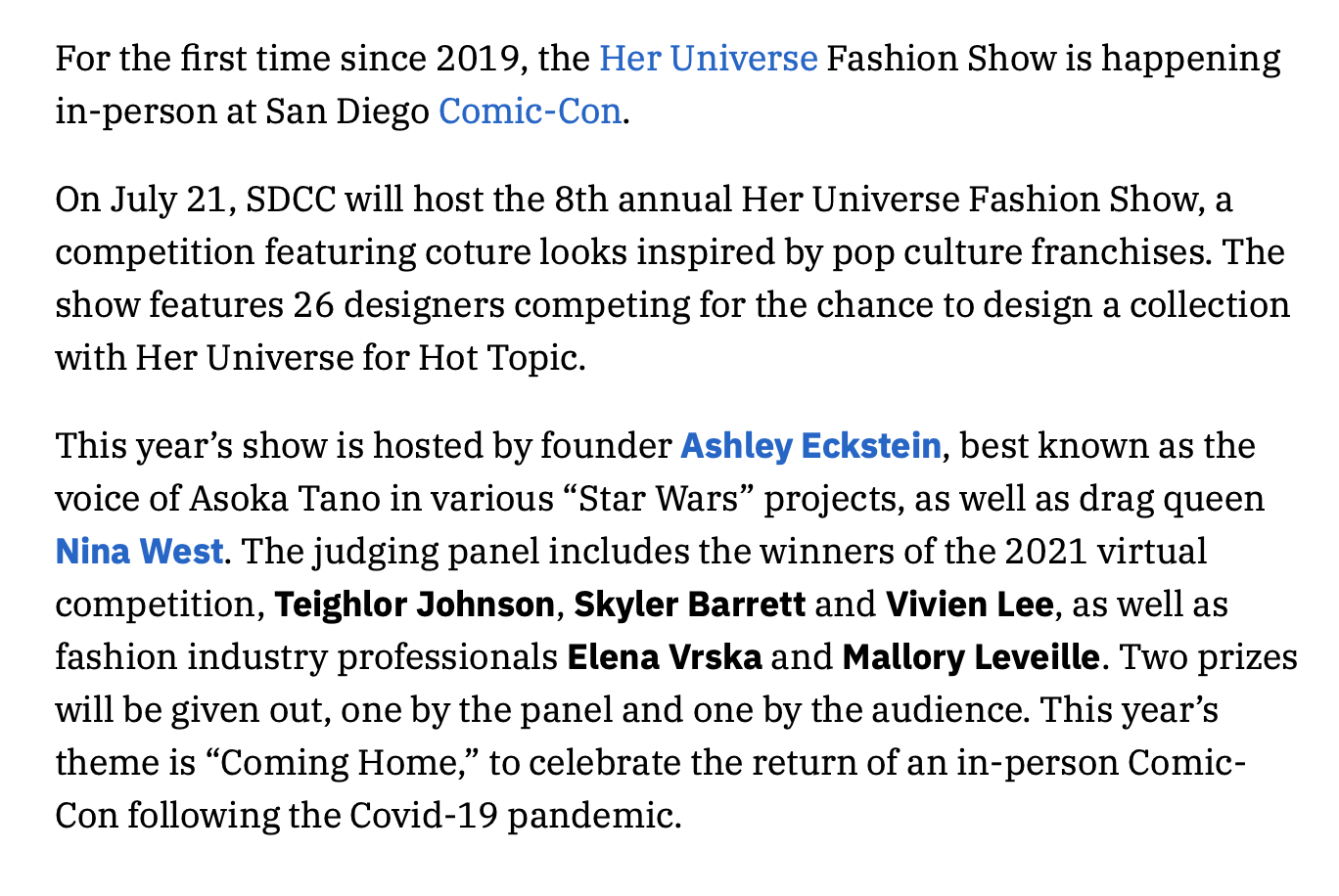 “SDCC 2022: Her Universe Fashion Show Returns to the Runway” (The Mary Sue July 23, 2022)