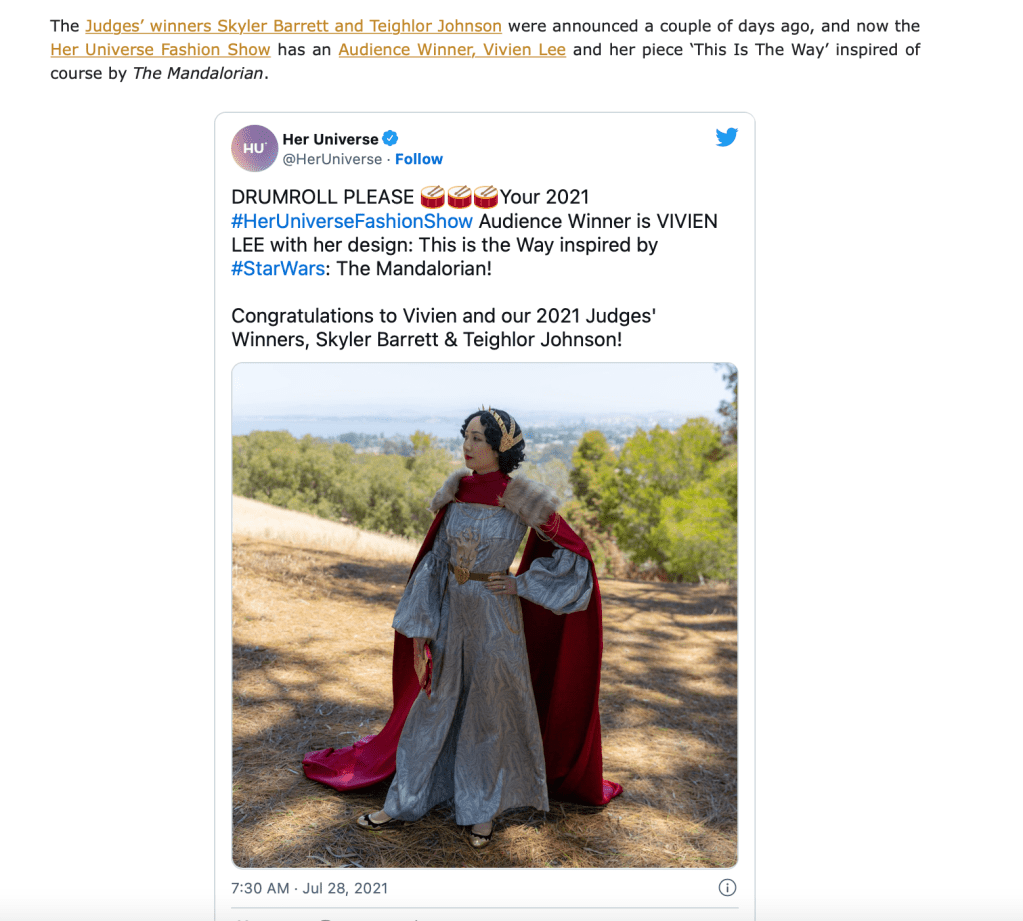 “The Her Universe Fashion Show: Audience Winner is Vivien Lee“ (Jedi News July 28, 2021)