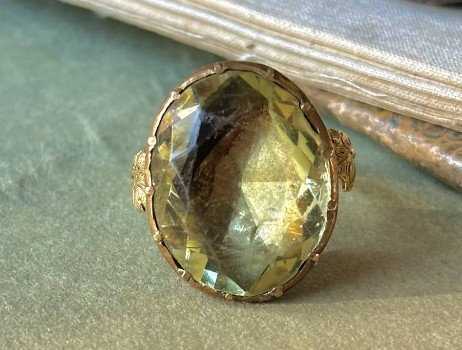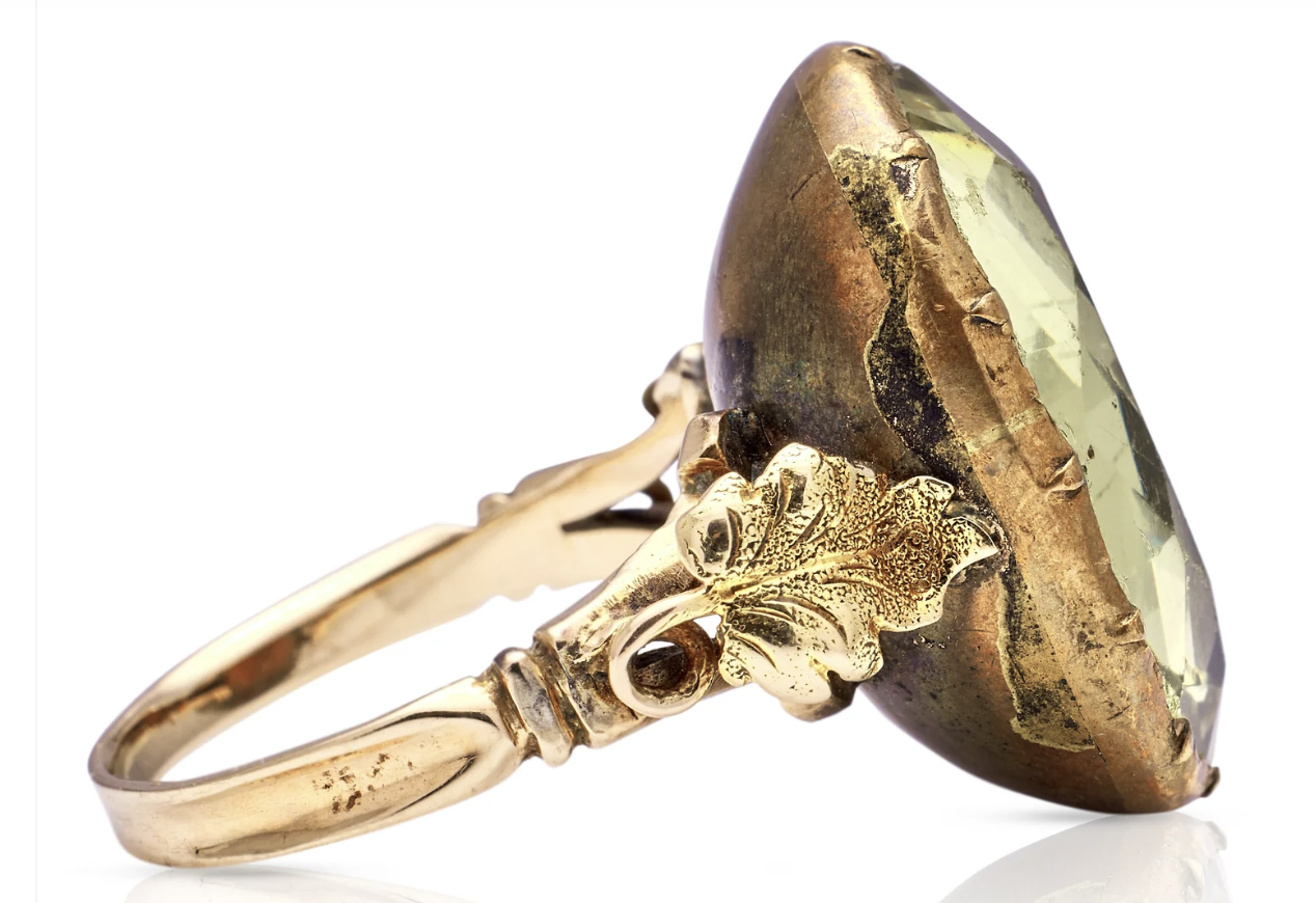 Paste stones (imitation gems) were also very popular in the 18th century, as seen in this eye-catching large green foiled paste stone ring.