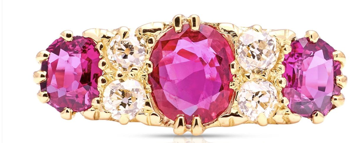 I think this ruby and diamond 3 stone ring would go great with a pink bustle dress!