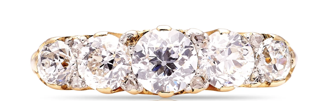 The Edwardian era includes part of the Belle Epoque and Art Nouveau eras, and some designs that are still very wearable today, such as this five stone diamond ring: