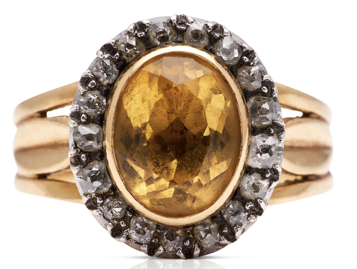 This antique citrine and diamond cocktail cluster ring would have looked amazing with a pretty yellow gown.