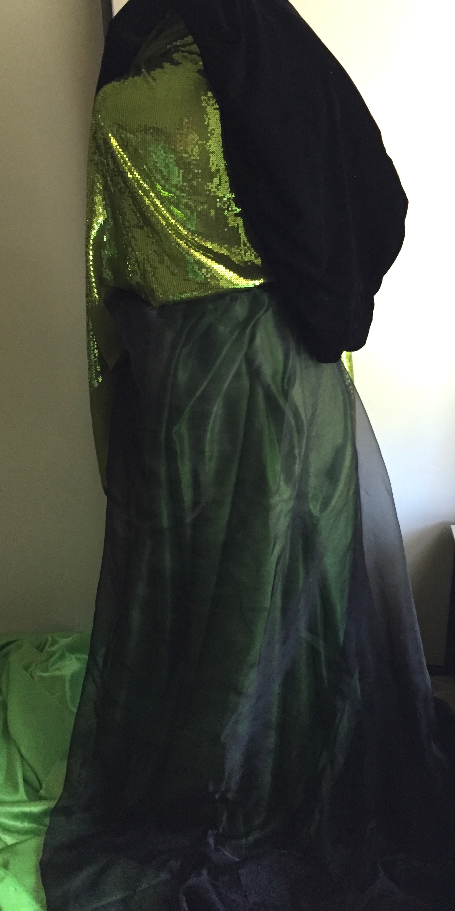 Photo AI have the overskirt cut out and partially sewn. I am using 8 yards of green satin and 10 yards of black organza. I am putting two layers of organza over the satin, since one layer is too sheer.